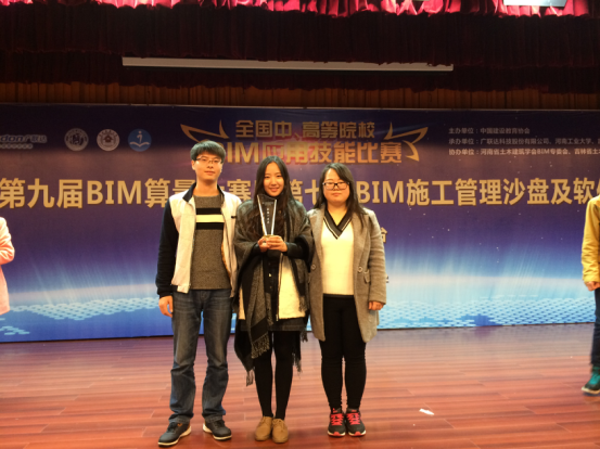 代表队由曹聪慧、宋晓刚两位老师指导。工程管理教研室主任李伟红老师率2013级工程管理专业学生胡航辉、2014级工程管理专业学生徐小宇和麻皓予三位选手参赛。在紧张的角逐中,三名同学不畏强手,沉着应战,熟练操作,团结协作,展现出顽强的拼搏精神和扎实的基本功,最终荣获全能赛和BIM安装算量两个一等奖及常规赛、BIM招标项目管理两个二等奖的佳绩。