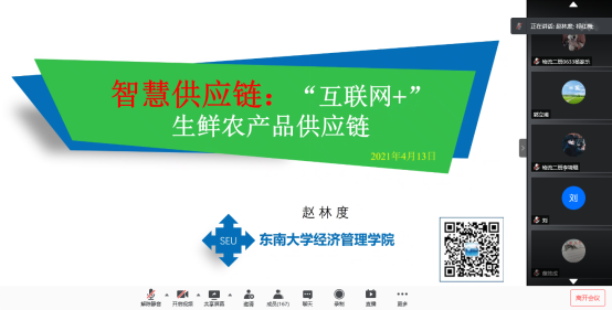 2021年4月13日,应我院和科研处邀请,赵林度教授在腾讯会议平台做题目为“智慧供应链:‘互联网+’生鲜农产品供应链”学术讲座,讲座由祁红梅院长主持,学院全体教师、研究生以及智慧物流班本科生等共180余人聆听了此次讲座。