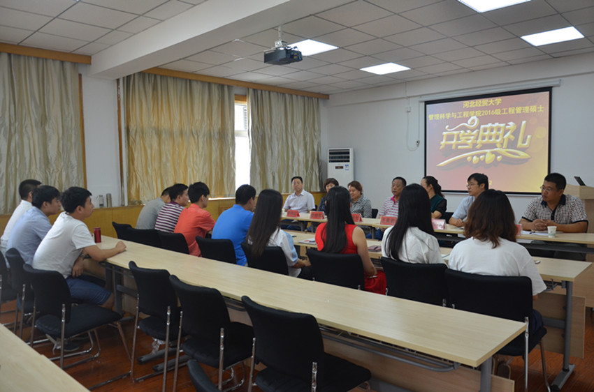 9月11日,管理科学与工程学院举行2016级工程管理硕士开学典礼。学院党委书记刘风长、院长王素君、副书记张晓军、副院长武彦斌出席,硕士研究生导师和2016级全体新生参加。典礼由副院长武彦斌主持。