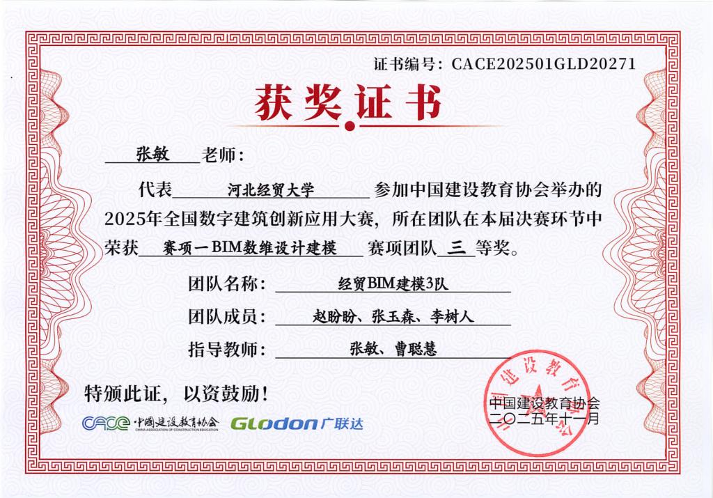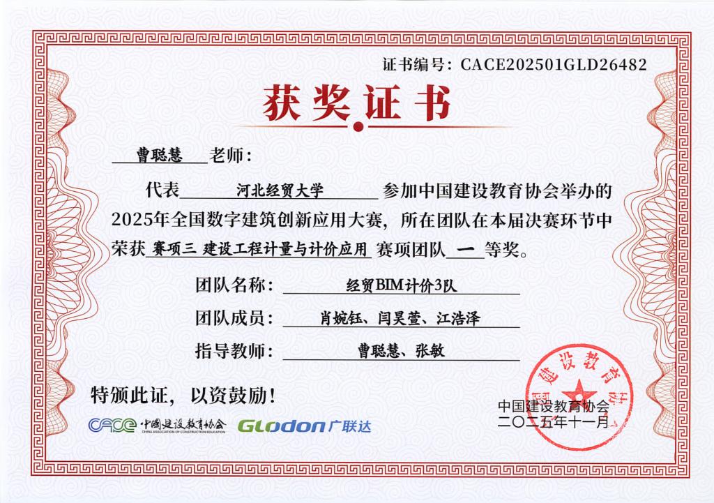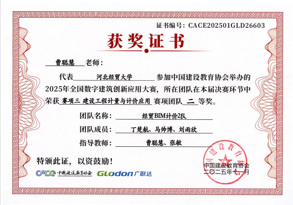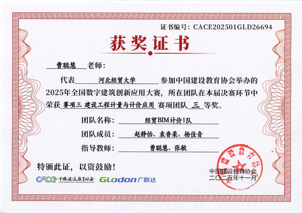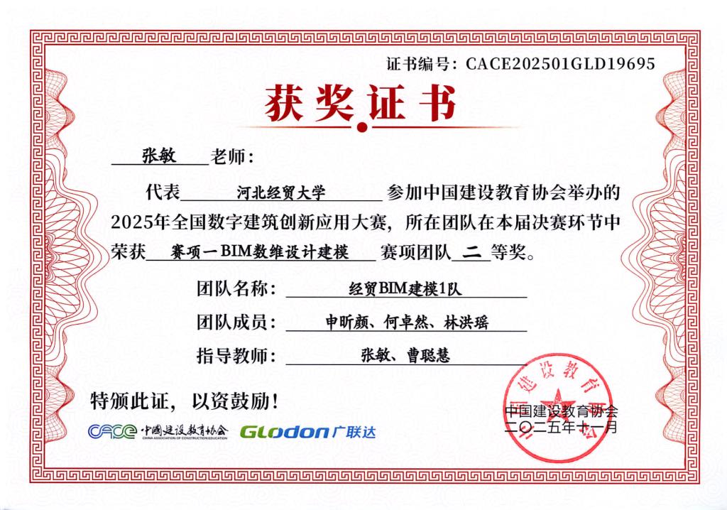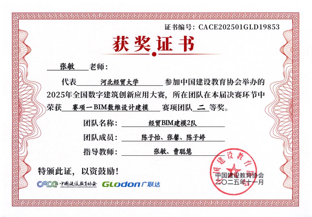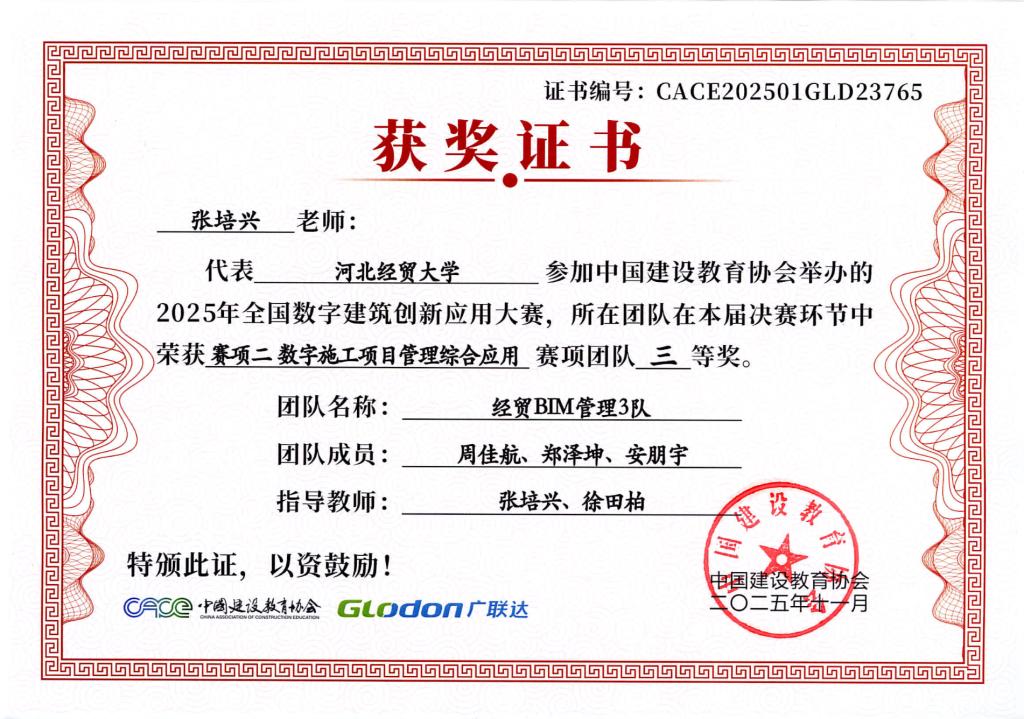本次大赛由中国建设教育协会主办,国家数字建筑行业产教融合共同体与广联达科技股份有限公司共同协办。大赛设置了BIM数维设计建模(赛项1)、数字施工项目管理综合应用(赛项2)、建设工程计量与计价应用(赛项3)三个赛项,分为两个阶段进行,2025年9月20日举办全国选拔赛,前60%进入2025年10月18日全国总决赛。大赛自2025年4月启动,yl6776永利集团工程管理系曹聪慧、张敏、张培兴、徐田柏等老师积极组织了9支队伍报名参加,经过精心的备赛,共有7支队伍突围进入总决赛,最终取得7项奖项。