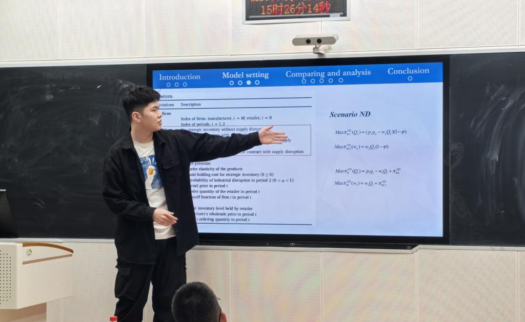 沙龙活动上,赵启轩分享了论文“Research on Recycling Channel Decisions in Dual-Channel Closed-Loop Supply Chains Considering Fairness Concerns”,详细介绍了该论文的研究背景、模型分析、数值仿真与结论。张玉潭分享了论文“Strategic inventory in semi-conductor supply chains under industrial disruption”,深入探讨了战略库存在减缓半导体供应链中断影响中起到的作用等问题,详细介绍了该论文的数据和模型建立,创新思路与解决方案。张雪峰、张少卿就两篇论文提出修改建议,并围绕本期主题的研究热点和重点对研究生进行了专业的指导。