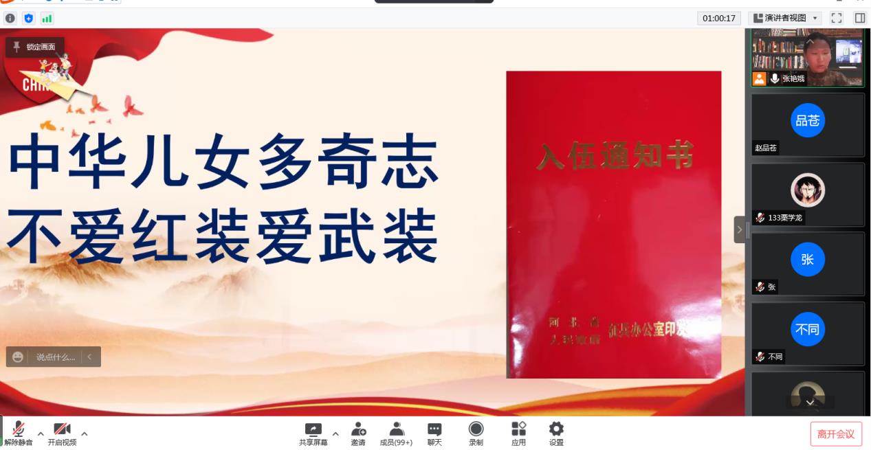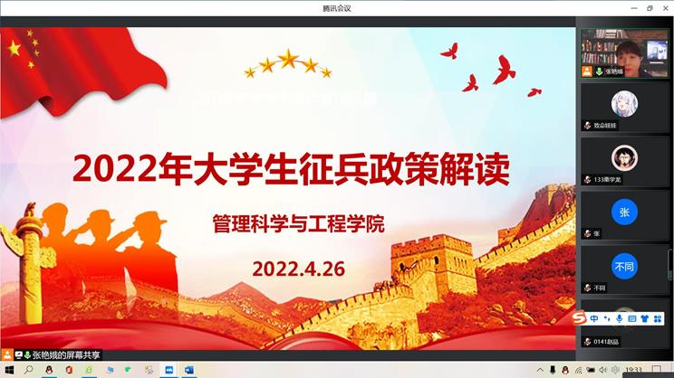 4月26日晚,我院通过腾讯会议召开大学生征兵政策宣讲会。本次宣讲会由党委副书记李丽主讲,全体辅导员、大四学生及大三全体男生参加。