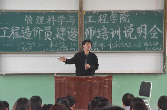 3月30日,管理科学与工程学院在第一阶梯教室召开工程造价员、建造师培训说明会,此次说明会由石家庄经济学院工程基础实验室主任张成福担任主讲,学院工程管理专业全体学生参加了此次会议。