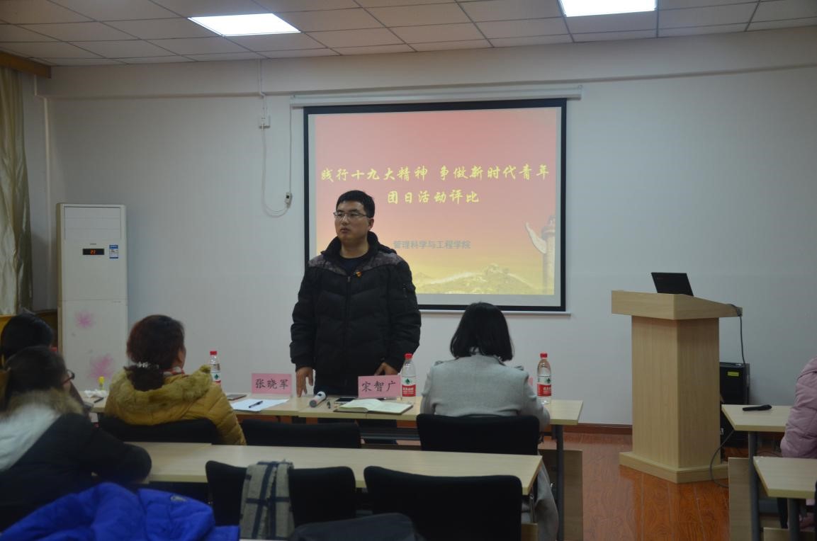 12月25日中午,管理科学与工程学院在第一教学楼408教室举办了学习十九大专题团日活动评比活动,学院党委副书记张晓军、团委书记宋智广以及全体辅导员老师到场并担任评委,各班级主要团学干部参加。