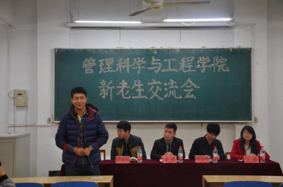 11月25日,管理科学与工程学院于第三教学楼B201教室召开新老生交流会。学院物流管理专业袁野、闫建旭,信息管理与信息系统专业王鹏洋,工程管理专业韩瑞峰、文静五位高年级优秀学生代参在会上与2014级新生就学习、生活、工作等方面进行了交流。