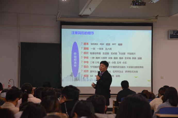 11月17日晚,管理科学与工程学院在A401教室举办以“做好求职简历,提高就业核心竞争力”为主题的简历设计技巧培训活动。我校就业指导教研室戎来老师担任主讲人。学院团委书记宋智广、15级学生辅导员王芳老师共同出席此次活动。