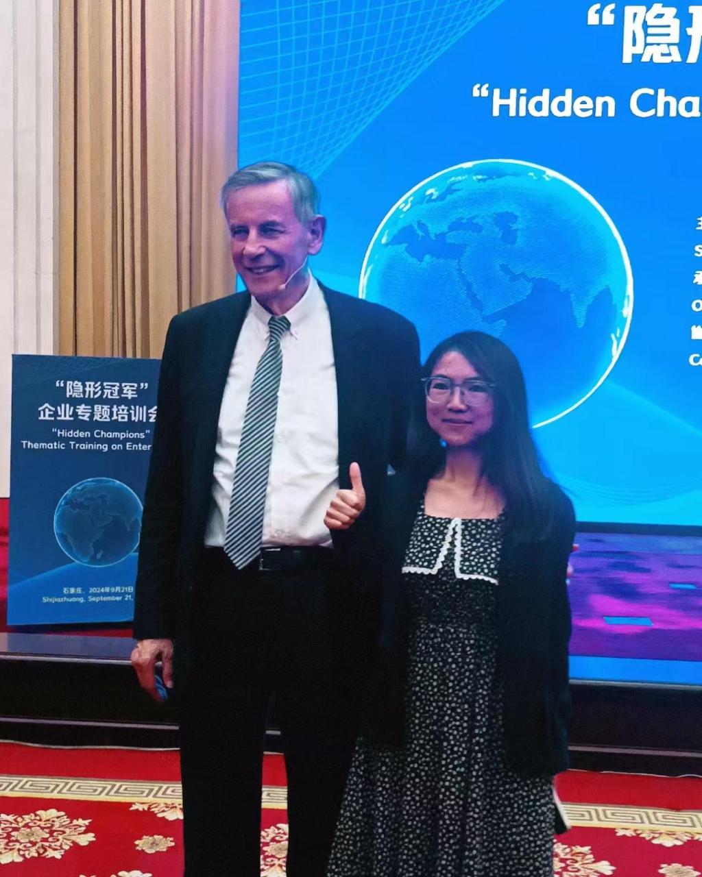 9月21日下午,由河北省科技厅主办的世界知名学者学术演讲会暨全球“隐形冠军”之父——赫尔曼·西蒙教授的企业专题培训会在太行国宾馆一楼柏坡厅举行。我院2023级MEM全日制研究生王乐、2024级MEM全日制研究生梁逸潇参加会议并就自己参研的河北中小企业科技特派员项目向赫尔曼·西蒙教授提问。